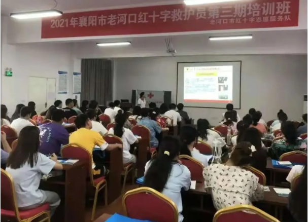7月28日,老河口市红十字会在美视界职业技能培训学校为80余名大学生开展暑期救护员培训,这也是今年开展的第三期救护员培训班。