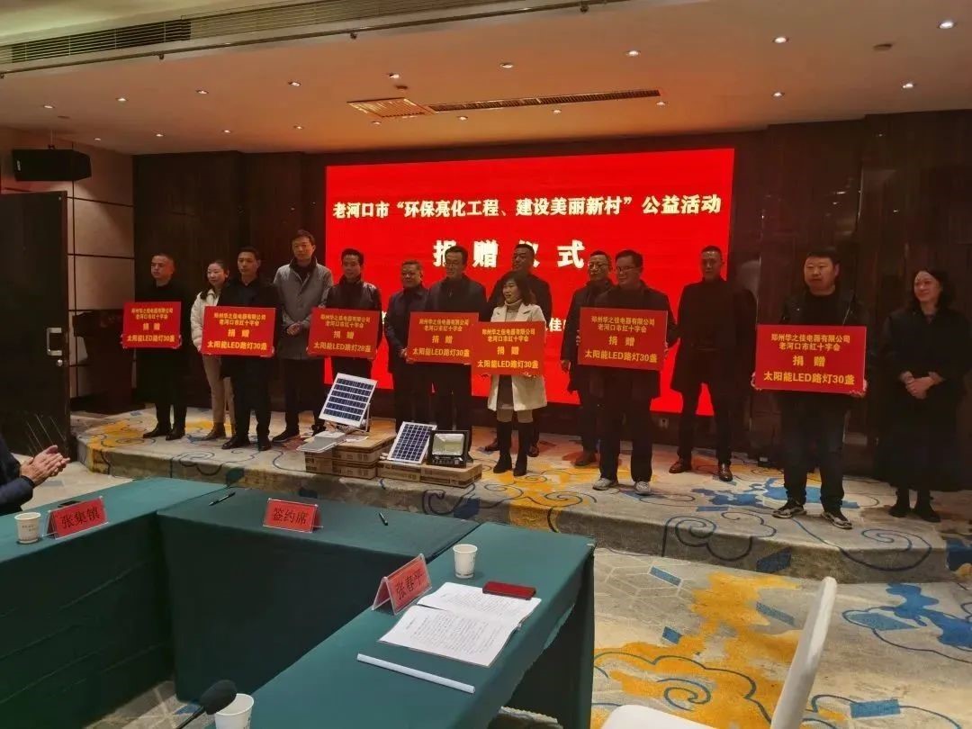 市红十字会与郑州华之佳电器有限公司进行家庭太阳能LED路灯捐赠签约仪式,现场向民政局以及6个“亮化工程”示范村授捐赠牌。